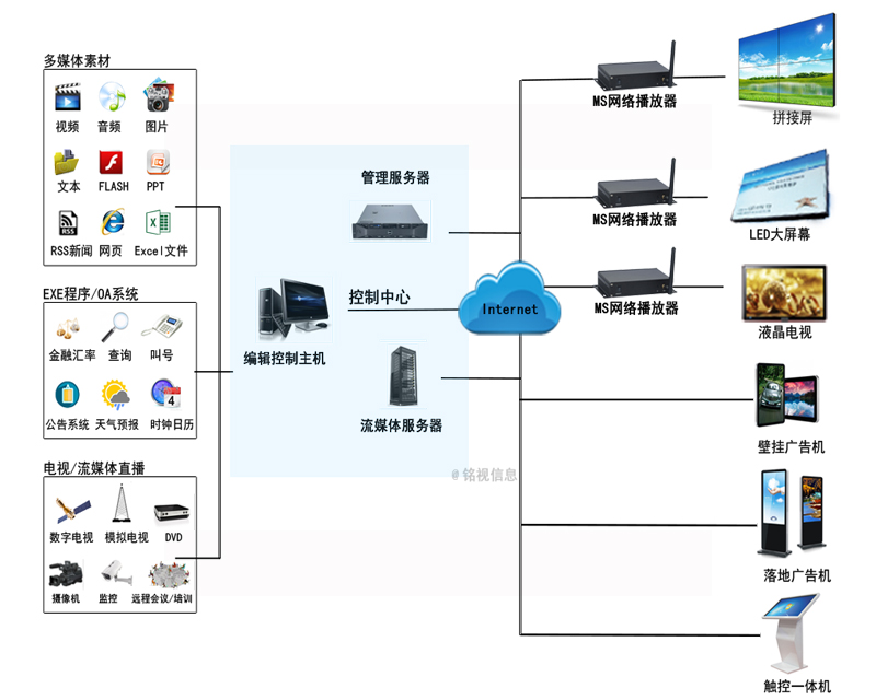 可搭建Linux服務器;最大負載終端數量大于1萬臺;支持多點同步播放;支持電視信號輸入。