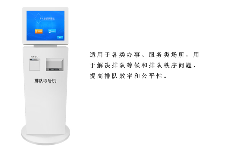 排隊(duì)叫號(hào)系統(tǒng)匹配的取號(hào)機(jī),常規(guī)尺寸有17、18.5、21.5、32、43、55寸,外設(shè)包括小票打印機(jī)、二維碼掃描模塊、身份證讀卡器模塊。
